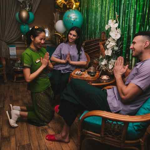 В салоне гостей окружают заботой и вниманием, они участвуют в традиционной чайной церемонии. Клиентов угощают сладостями из Таиланда и редким элитным чаем. В ассортименте: молочный улун, черный с лемонграссом, жасминовый, чай на основе синей орхидеи и много других сортов. В салоне звучит расслабляющая музыка, пахнет аромамаслами — атмосфера полной гармонии и релакса.